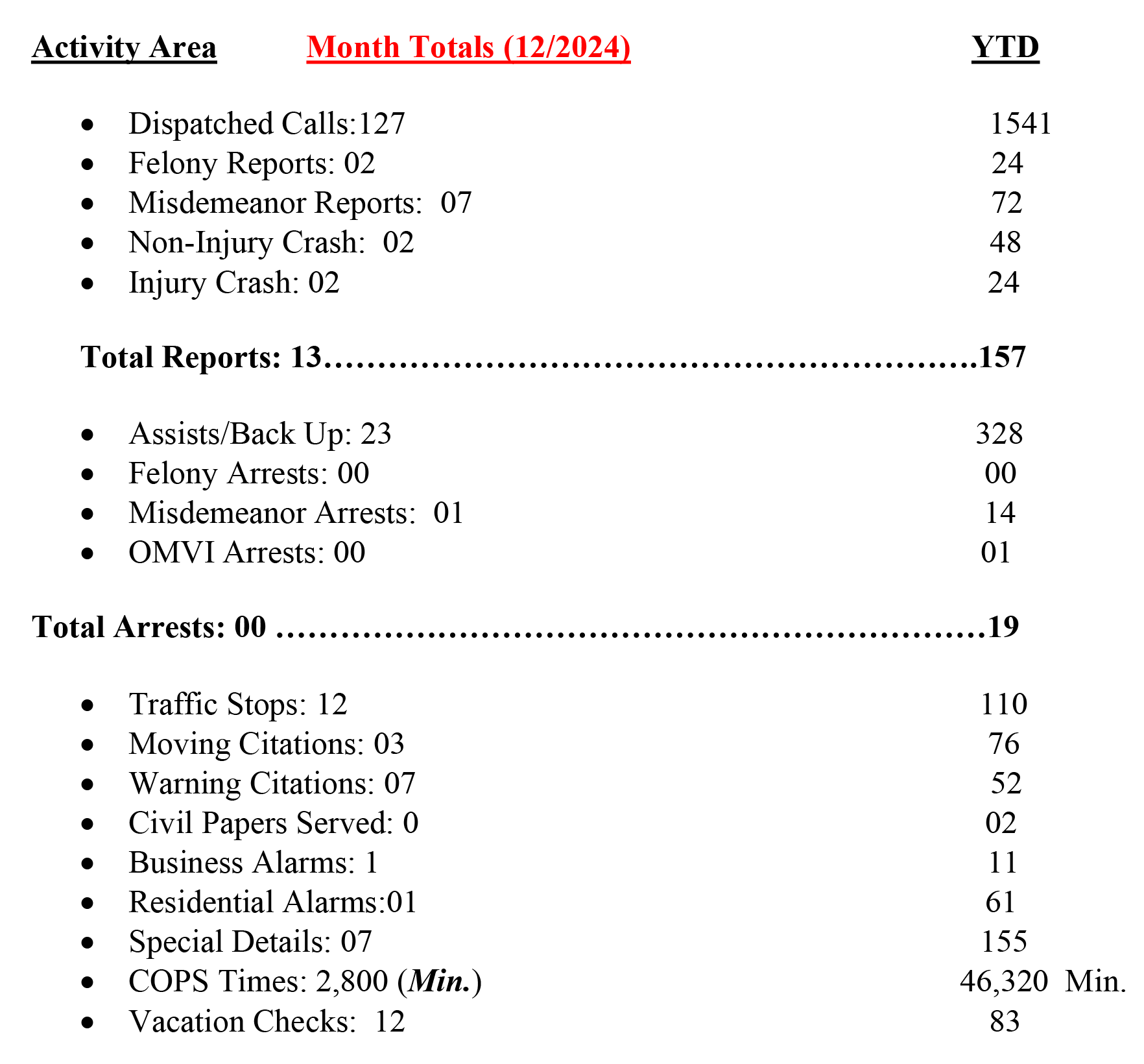 Hanover Township has two experienced and dedicated officers under contract from the Butler County Sheriff’s Office. This contract can be continued thanks to the support of the Community in approving 1.75 Mil General Operating Levy in 2017. These officers serve the residents of Hanover Township exclusively and pay extra attention to needs of the residents. This contracted service is supplemented by the Sheriff’s Office regular patrol units, which serve the western townships of Butler County. Hanover Township is in District #18. The dedicated officers patrol subdivisions, county roads, cemeteries, parks and business districts. They offer information on laws, vehicles, home security, and crime prevention programs and provide monthly reports to the Township Administration during regularly scheduled Board of Trustees meetings. Summary statistics for the 2023 year reported during the January 2025 Township meeting for two contract units include: